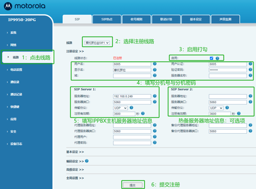 摩托羅拉IPP9950-20PG局域網電話注冊詳細步驟本地話機注冊方法說明為:菜單→高級→密碼(123)→賬號→SIP1→設置→注冊(開啟)→注冊地址(填寫 IPPBX 服務器地址)→注冊用戶名(分機號)→注冊密碼(填寫)→SIP 用戶(與分機號一致)→注冊端口(IPPBX 注冊端口)→最后點擊確認,注冊成功!