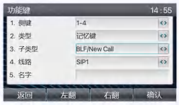 摩托羅拉IPP9950-20PG話機(jī)界面:長(zhǎng)按某個(gè)功能鍵進(jìn)入功能鍵設(shè)置界面,或通過(guò)【菜單】>>【設(shè)置】>>【鍵盤設(shè)置】 >>【功能鍵設(shè)置】進(jìn)入功能鍵設(shè)置界面,設(shè)置功能鍵類型為記憶鍵,子類型為 BLF/NEW CALL, BLF/BXFER, BLF/AXFER,BLF/CONF,BLF/DTMF,號(hào)碼為被訂閱號(hào)碼,設(shè)置對(duì)應(yīng)的 SIP 線路,如下圖所示: